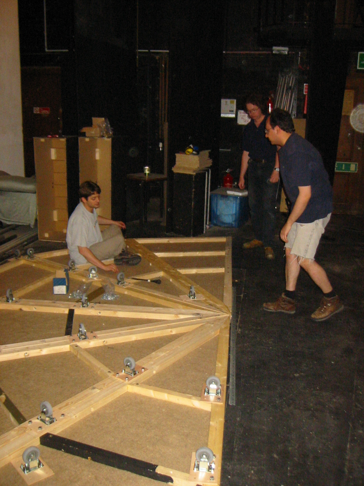 News from Dan Young that the stage and floor of the hall in Budleigh have been sanded and varnished. This is a nightmare for us since it means that none of the set can be fixed directly to the floor, also all of the steeldecks will need to be placed on shims, and the legs footed and placed on shims. Wooden support legs will need to be cross braced to each other rather than being attatched to the floor, more of a concern for the stage left corner where it is all woodwork rather than decking. Will also need to tie the steps into the staging to stop them sliding forward when the gangplank is used. Painting will need to be done on dust sheets, also need to be carefull about workbenches scratching the floor, and moving the backstage cupboards around.
