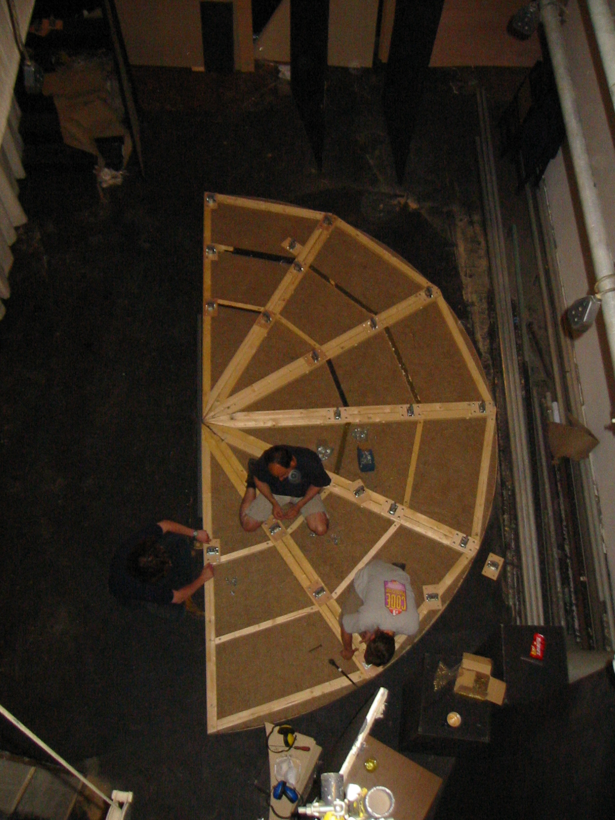 Meanwhile various stateroom flat frames were being skinned in the 3mm ply. Enough of these were done such that they could be assembled onto one of the revolves that had been flipped onto it's wheels to allow everyone to get an idea of the size of the staterooms and how they fit together with the various bits of bracing. This also proved that the formed center flats fit around the pivot pole in the manner expected.