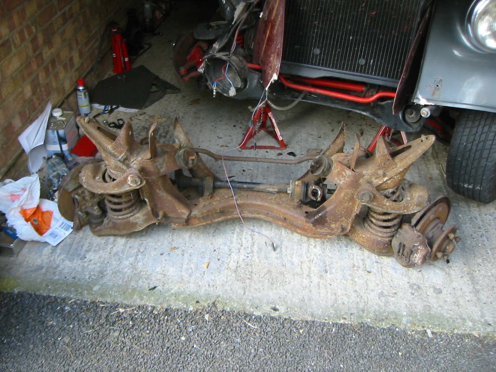 An early start to head up to North Wales to pick up a front axles assembly from a Cortina in a car dismantlers yard. In some respects it was easier to remove that I expected, supporting the engine weight didn't prove to be too much of a problem. Getting the bolts out was another matter, they were badly rusted in most cases, and awkward to get at. Other than requiring a thorough clean and a repaint, the components all look to be in good condition.