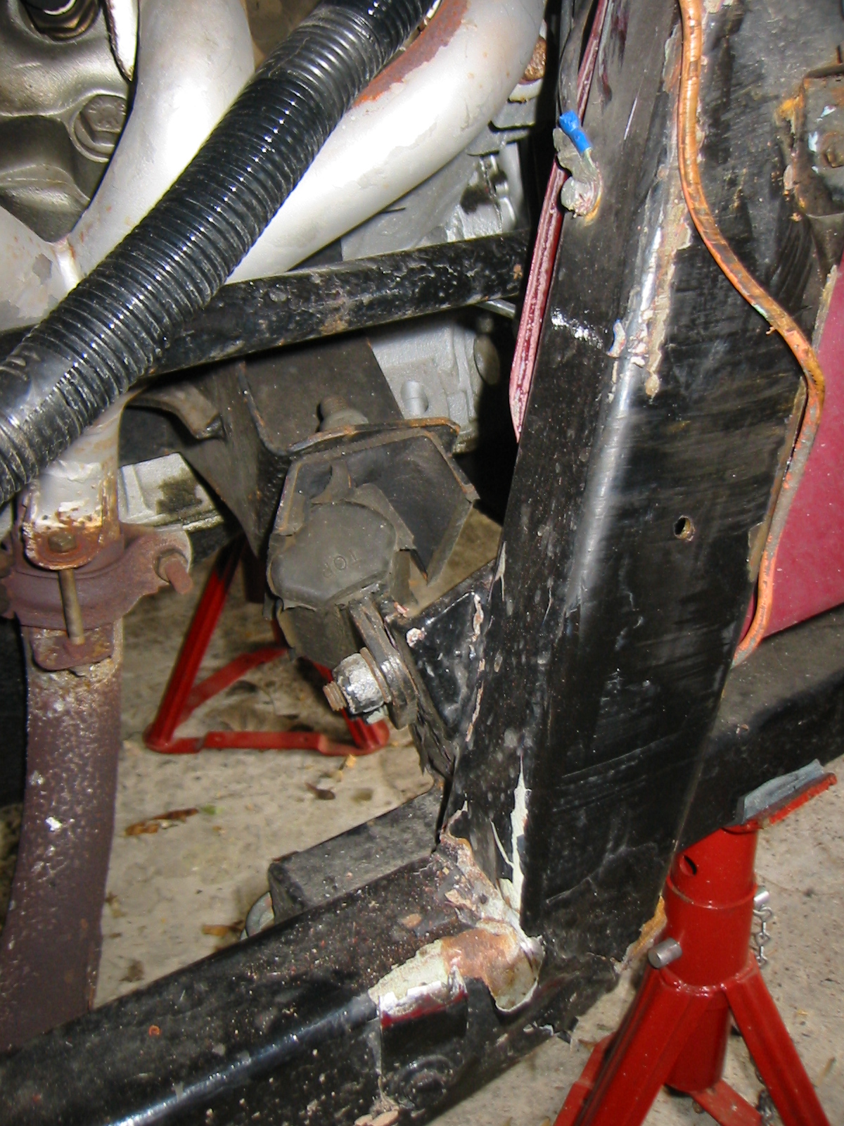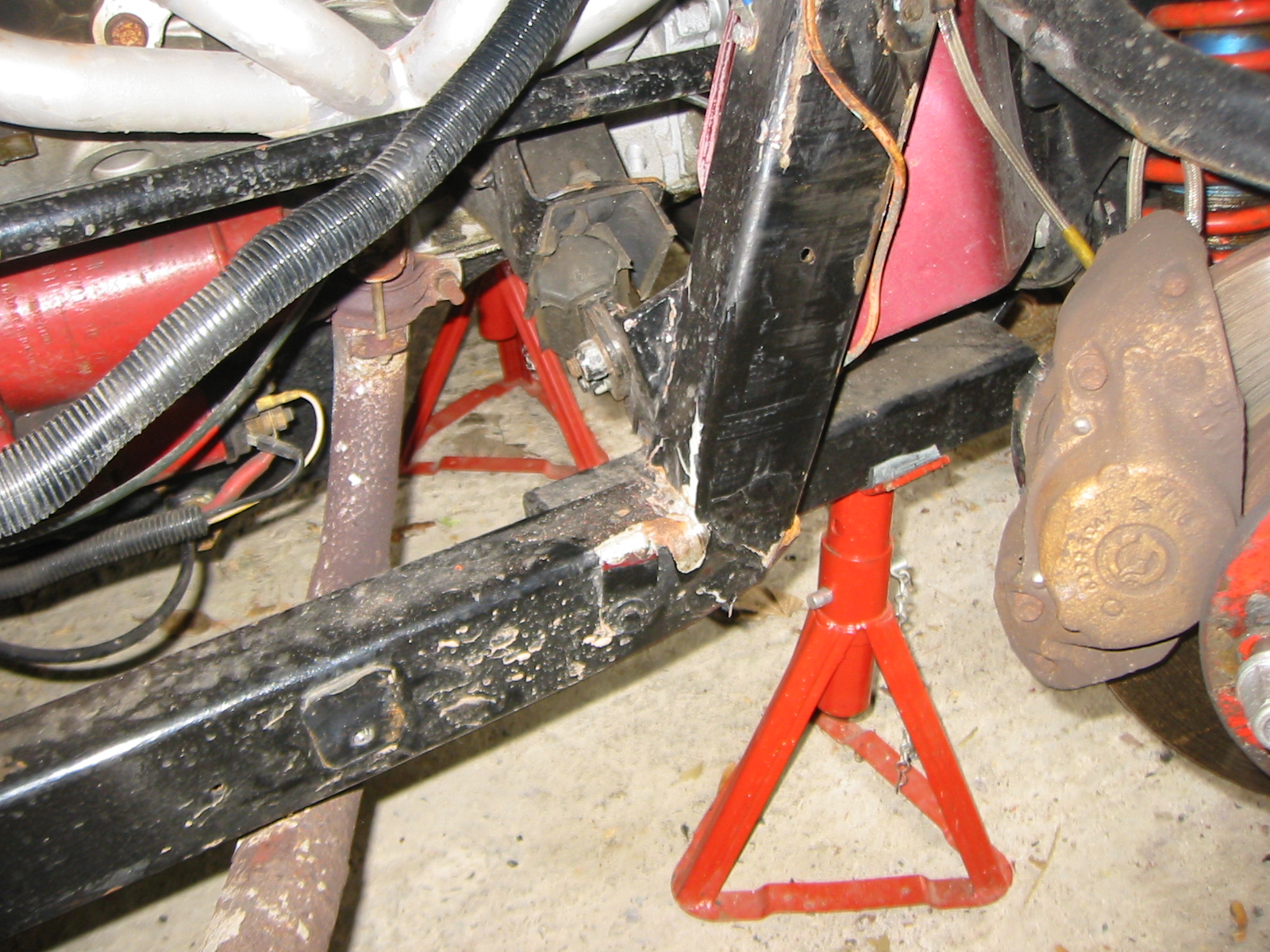 Got a closer look at the diagonal chassis member. The bolt holding the upper suspension arm in place has been forced into the chassis member making a severe indentation into it. It is unclear whether this can be patched over, or whether the entire piece will need to be cut out and a completely fresh piece welded into place.