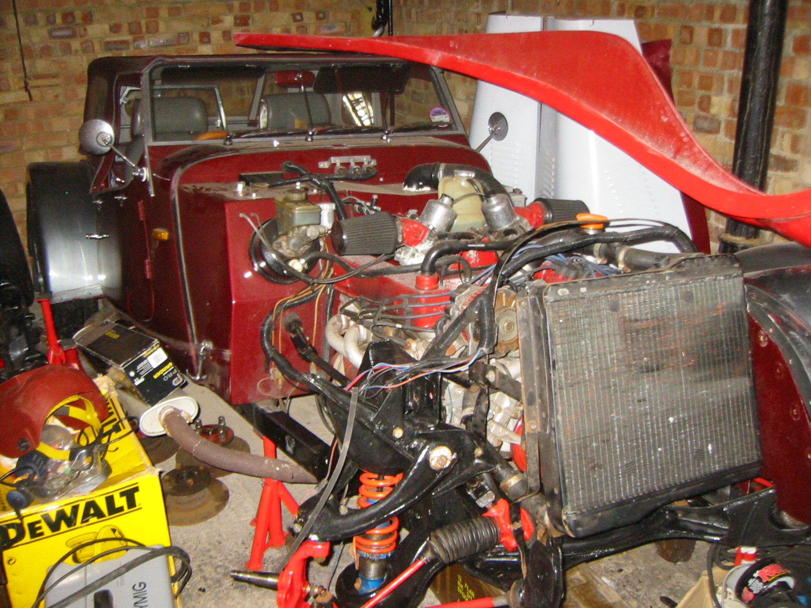 Moved the front hoop and radiator back into place and attatched it loosely to the sub-frame. I'm loathe to fix it any more securely until I've had a chance to offer both the nose cone and bonnet halves up to the build. Both of these attatch to the hoop at the very top.