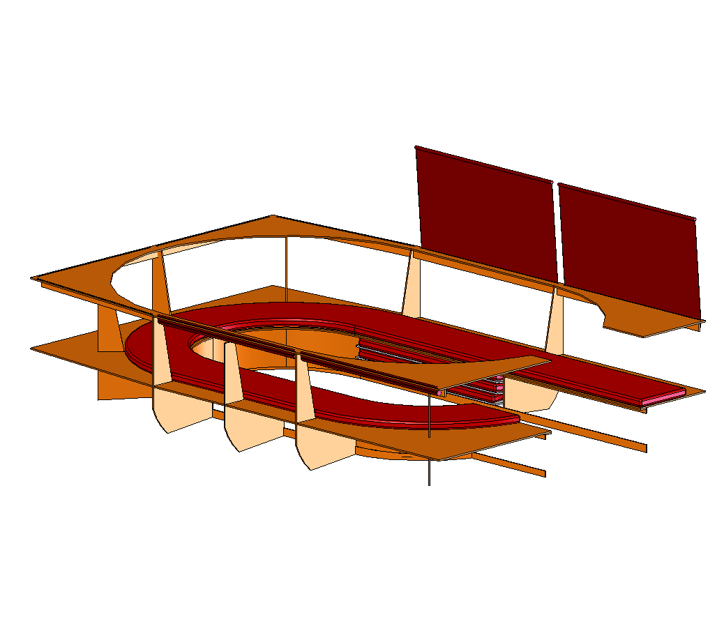 The floor of the upper salon is barreled, with a rise of perhaps 2" between the centre and edge. This design of all floor standing structures need to bear this in mind. From photo's it's not a true radius, but a gentle rise from one edge to a support beam, a horizontal section across the middle and then a gentle decline back down to the far edge.